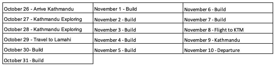 On October 29th the team will fly to Lamahi. Starting October 30th you will head to a school in Dang where you will work on the construction of classrooms. The next 9 days will be exhausting, but fulfilling. While in Dang, you will have the opportunity to meet many of Her International students and mothers.